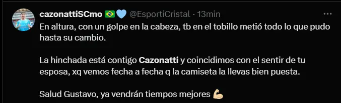 Ambos jugadores brasileños vienen demostrando con creces lo que significa defender la camiseta celeste como realmente la historia y el prestigio de la institución lo indica, sentimiento que debería ser visto y sobre todo imitado por sus demás compañeros en el plantel. Hoy Cazonatti jugó casi todo el partido con un tremendo dolor en la cabeza tras un durísimo choque en el primer tiempo. Es más, el comando técnico quiso cambiarle, pero se negó y terminó siendo una de las figuras más importantes del encuentro. Apuesta en Betsson a los partidos de las mejores ligas del mundo y recibe un bono de bienvenida de 50 soles