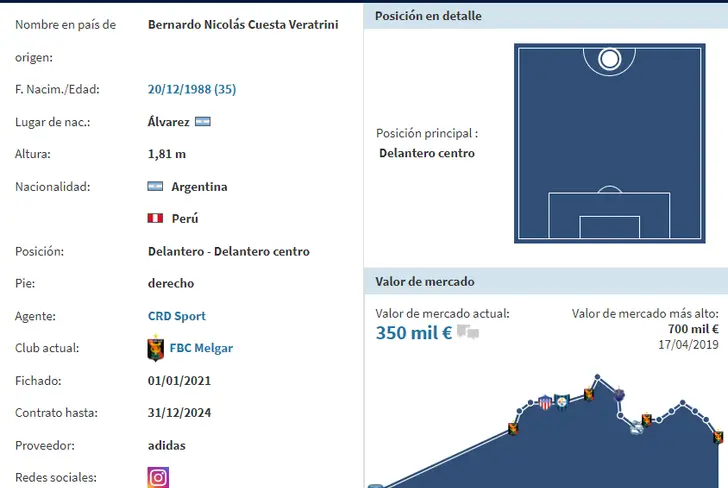 Bernardo Cuesta, delantero argentino con nacionalidad peruana de 35 años, tiene una cotización monetaria de 350 mil euros, lo que en soles daría un promedio cercano a los 1,4 millones, de acuerdo al portal especializado 'Transfermarkt'. Veremos si finalmente se concreta el nuevo acuerdo entre el goleador y la directiva del FBC Melgar de Arequipa en los próximos días y así todo el pueblo characato celebra dicha noticia.