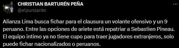 "Alianza Lima busca fichar para el clausura un volante ofensivo y un 9 peruano. Entre las opciones de ariete está repatriar a Sebastien Pineau. El equipo intimo ya no tiene cupo para traer jugadores extranjeros, solo puede fichar nacionalizados o peruanos", fue lo que dio a conocer en sus redes sociales, Christian Barturén. Apuesta en Betsson a los partidos de las mejores ligas del mundo y recibe un bono de bienvenida de 50 soles