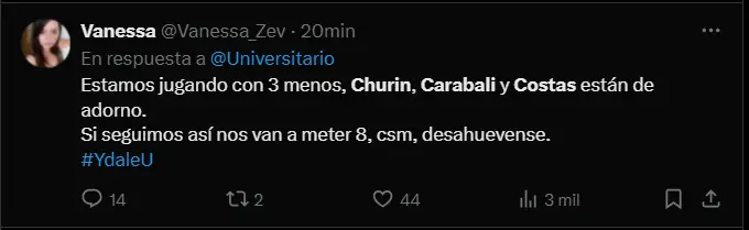 En el enfrentamiento entre Universitario de Deportes y River Plate, correspondiente a la Copa Libertadores, los cremas están enfrentando una desventaja de 0-1 en lo que va del segundo tiempo en Lima. Si bien el marcador refleja una jugada desafortunada, lo que realmente ha preocupado a los hinchas de la 'U' es la falta de actitud y desempeño de tres jugadores claves: Diego Churín, José Carabalí y Gabriel Costa. La sensación general es que, con su falta de entrega en el campo, Universitario ha estado jugando "con tres menos", lo que ha permitido que River Plate aproveche la situación para adelantarse en el marcador.