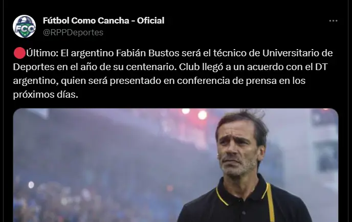 “Último: El argentino Fabián Bustos será el técnico de Universitario de Deportes en el año de su centenario. Club llegó a un acuerdo con el DT argentino, quien será presentado en conferencia de prensa en los próximos días”; fue la más reciente y reveladora información con la que la cuenta oficial de ´Fútbol Como Cancha´ confirmó que el cuadro crema encontró al reemplazante de Fossati pensando en el siguiente año y de esta manera se descartan otras teorías que al parecer no llegaron a buen puerto en cuanto a las negociaciones. Apuesta en Betsson a los partidos de las mejores ligas del mundo y recibe un bono de bienvenida de 50 soles