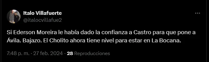 Frente a esta situación es que un jugador celeste en particular viene siendo duramente cuestionado. “Si Enderson Moreira le había dado la confianza a Castro para que pone a Ávila. Bajazo. El Cholito ahora tiene nivel para estar en La Bocana”; fue el más reciente comentario del comunicador deportivo Italo Villafuerte en señal de que el delantero no viene demostrando estar a la altura de las expectativas cuando más se lo necesita en estos momentos.