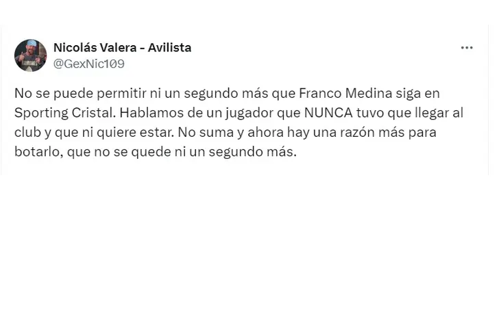 "¡FRANCO MEDINA Y ALEJANDRO HOHGBER NO PUEDEN JUGAR NI UN MINUTO MÁS EN SPORTING CRISTAL!", "Sporting Cristal debe de jugar con 10 jugadores antes de poner en su equipo a Franco Medina", "No se puede permitir ni un segundo más que Franco Medina siga en Sporting Cristal. Hablamos de un jugador que NUNCA tuvo que llegar al club y que ni quiere estar. No suma y ahora hay una razón más para botarlo, que no se quede ni un segundo más", fueron algunos comentarios de los hinchas cerveceros en 'X'.