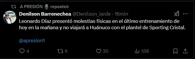 Sporting Cristal sufrió un duro golpe en las horas previas a su debut en la Liga 1 ante Alianza Universidad en Huánuco. Según el periodista Denilson Barrenechea, el defensor central Leonardo Díaz se vio obligado a abandonar los entrenamientos matutinos debido a molestias físicas y, por ende, no formará parte de la delegación que viajará a la ciudad de Huánuco.