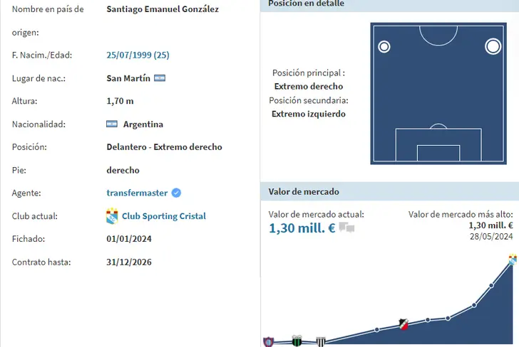 Santiago González, o más conocido como ‘El Mágico’, tiene una cotización monetaria de 1,3 millones de euros, lo que en soles daría un promedio cercano a los 5,2 millones, según el portal especializado ‘Transfermarkt’. Cuando llegó proveniente del Deportivo Maipú de la segunda división del fútbol argentino costaba alrededor de 900 mil euros, pero gracias a sus muy buenos rendimientos a nivel local e internacional anotando es que ha podido incrementar en gran medida su ficha y claramente desde las altas instancias de Sporting Cristal esperan que siga por este mismo camino.