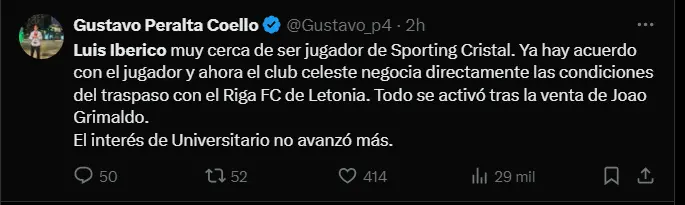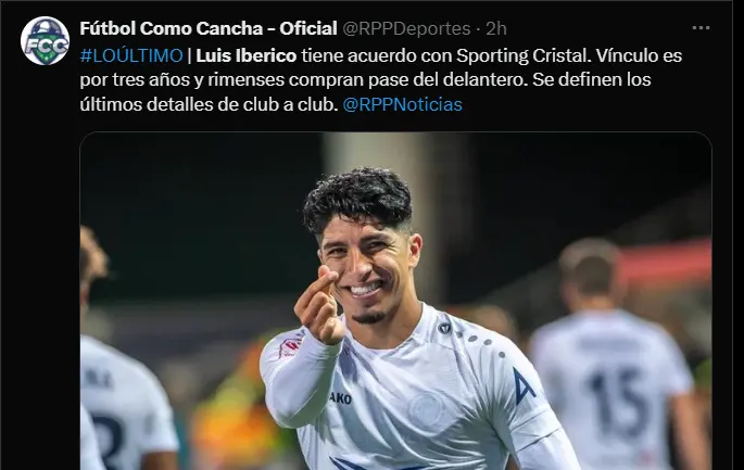 "Luis Iberico tiene acuerdo con Sporting Cristal. Vínculo es por tres años y rimenses compran pase del delantero. Se definen los últimos detalles de club a club"; fue la más información que compartió el portal 'Fútbol Como Cancha' a través de su cuenta oficial de twitter. "Luis Iberico muy cerca de ser jugador de Sporting Cristal. Ya hay acuerdo con el jugador y ahora el club celeste negocia directamente las condiciones del traspaso con el Riga FC de Letonia. Todo se activó tras la venta de Joao Grimaldo. El interés de Universitario no avanzó más"; informó el reconocido comunicador deportivo Gustavo Peralta respecto al inminente refuerzo cervecero.