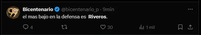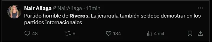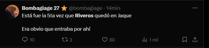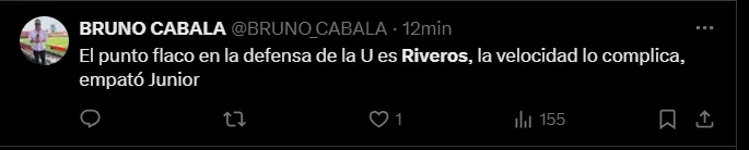 “Partido horrible de Riveros. La jerarquía también se debe demostrar en los partidos internacionales”, “El punto flaco en la defensa de la U es Riveros, la velocidad lo complica, empató Junior”, “Está fue la 5ta vez que Riveros quedó en Jaque. Era obvio que entraba por ahí” y “El más bajo en la defensa es Riveros”; son algunos de los comentarios más llamativos y resonantes que se pueden apreciar en las redes sociales respecto a la actuación del zaguero paraguayo.