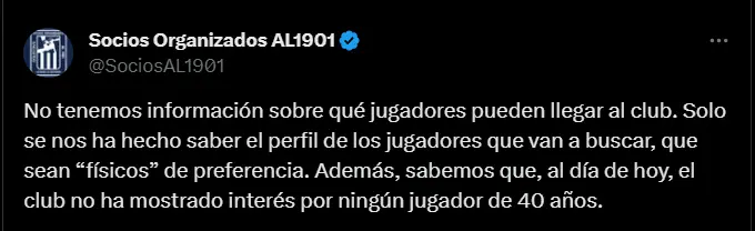 “No tenemos información sobre qué jugadores pueden llegar al club. Solo se nos ha hecho saber el perfil de los jugadores que van a buscar, que sean ´físicos´ de preferencia. Además, sabemos que, al día de hoy, el club no ha mostrado interés por ningún jugador de 40 años”; fue la revelación en señal de que no hay ningún tipo de cercanía con el tan comentado fichaje de un ´Depredador´ que anda suelto en plaza y que incluso ha mencionado en diversas oportunidades que todavía tiene el sueño de jugar en Matute.