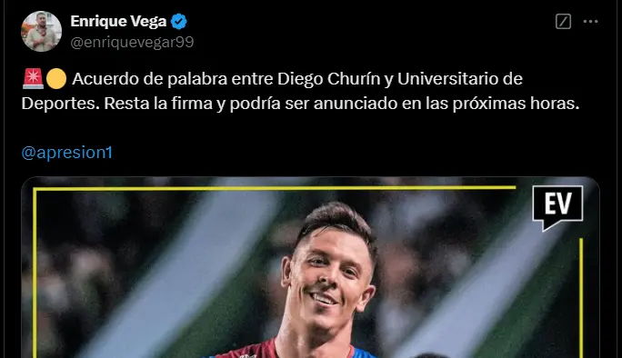 En los próximos días conoceremos más detalles sobre la presentación oficial de Diego Churín como nuevo jugador de Universitario. La hinchada crema espera con ansias el debut del delantero argentino y confía en que pueda aportar mucho al equipo.