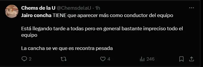 Y es que hoy nuevamente el volante fue titular y claramente los aficionados de Universitario de Deportes esperaban que sea el verdadero conductor del equipo para que puedan dar un salto de calidad en una plaza muy complicada que siempre le ha costado al club. Al ver que no tuvo grandes rendimientos ni estuvo claro en sus apariciones, el nombre de Concha viene generando tendencia de una manera negativa y sin cuestión alguna.