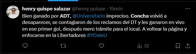 “Jairo Concha TIENE que aparecer más como conductor del equipo. Está llegando tarde a todas pero en general bastante impreciso todo el equipo. La cancha se ve que es recontra pesada”, “Boten del club a Jairo Concha por favor”, “Concha está basura hoy” y “Bien ganado por ADT, Universitario impreciso. Concha volvió a desaparecer, se contagiaron de los reclamos del DT y les ganaron en vivo en ese primer gol, después mero trámite para el local. A voltear la página y enfocarse en la Libertadores”; son algunos de los comentarios más llamativos que se pueden apreciar en las redes sociales. Apuesta en Betsson a los partidos de las mejores ligas del mundo y recibe un bono de bienvenida de 50 soles