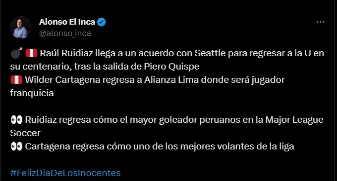 “Raúl Ruidíaz llega a un acuerdo con Seattle para regresar a la U en su centenario, tras la salida de Piero Quispe. Wilder Cartagena regresa a Alianza Lima donde será jugador franquicia. Ruidíaz regresa cómo el mayor goleador peruanos en la Major League Soccer. Cartagena regresa cómo uno de los mejores volantes de la liga”; fue el dato revelador que se pudo conocer, aunque luego se pudo leer el hashtag #FelizDiaDeLosInocentes en señal de que es una jugada maestra por un día tan especial y donde los usuarios deben aceptar una que otra broma por ahí… si o no.