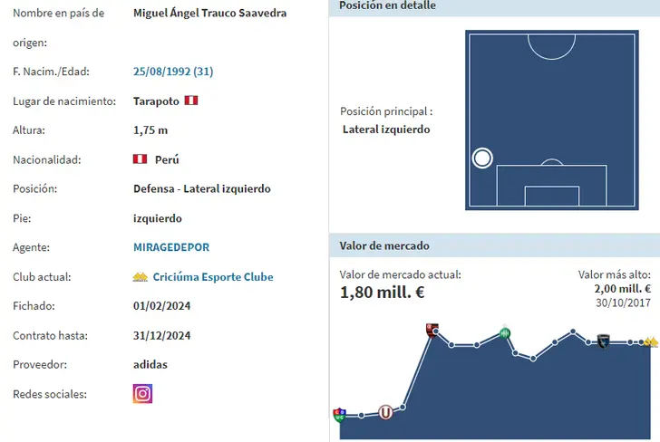 El lateral peruano de 31 años tiene una cotización internacional de 1,8 millones, lo que en soles daría un promedio muy cercano a los 7,2 millones, de acuerdo al portal especializado ´Transfermarkt´. La posibilidad está ahí y quizá lo más acorde a las pretensiones de Universitario de Deportes sería conseguir un acuerdo de préstamo con el Criciúma de Brasil ya que de esta manera podría asegurar mayor continuidad en un equipo como el merengue en donde de todas formas sería titular a como dé lugar.