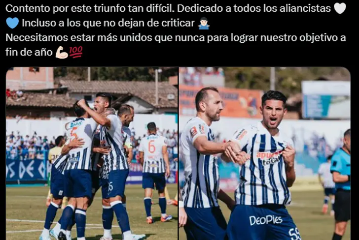 "Contento por este triunfo tan difícil. Dedicado a todos los aliancistas. Incluso a los que no dejan de criticar. Necesitamos estar más unidos que nunca para lograr nuestro objetivo a fin de año", fue lo que publicó Carlos Zambrano en sus redes sociales, este duro mensaje va para la unión que se espera que tenga el club en este momento, pues claro, con todo lo ocurrido, el hincha se ha separado un poco y ha dejado de alentar desde la cancha.