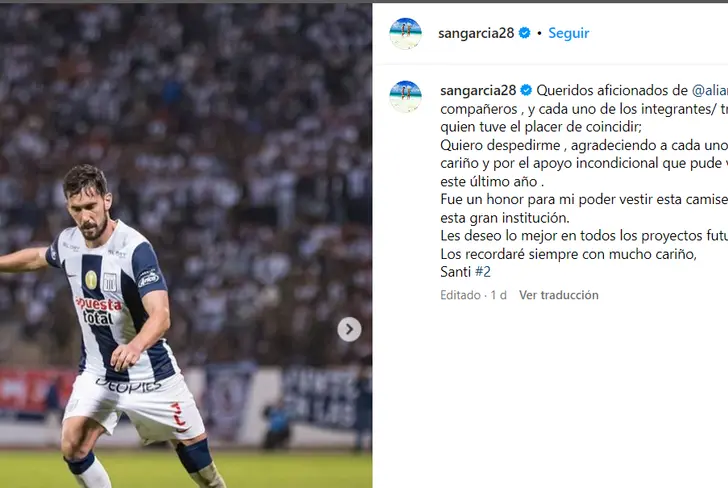 “Queridos aficionados de Alianza Lima, compañeros, y cada uno de los integrantes/trabajadores con quienes tuve el placer de coincidir. Quiero despedirme agradeciendo a cada uno de ustedes, por el cariño y por el apoyo incondicional que pude vivir y disfrutar este último año”; fue parte de la publicación que compartió Santiago García a través de su cuenta oficial de instagram.