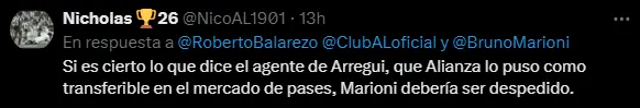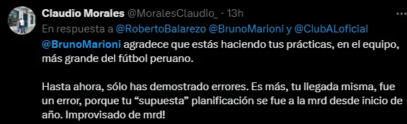 El gerente deportivo de Alianza Lima, Bruno Marioni hoy día es bastante criticado por lo que ha hecho en el cuadro 'blanquiazul' desde que llegó, pues sus decisiones han ido en contra del club, como por ejemplo dejar fuera a Carlos Zambrano, no traer a Paolo Guerrero, entre otras que han sido muy importantes como la contratación de Jeriel De Santis como refuerzo, terminando siendo el peor fichaje incluso de la Liga 1.