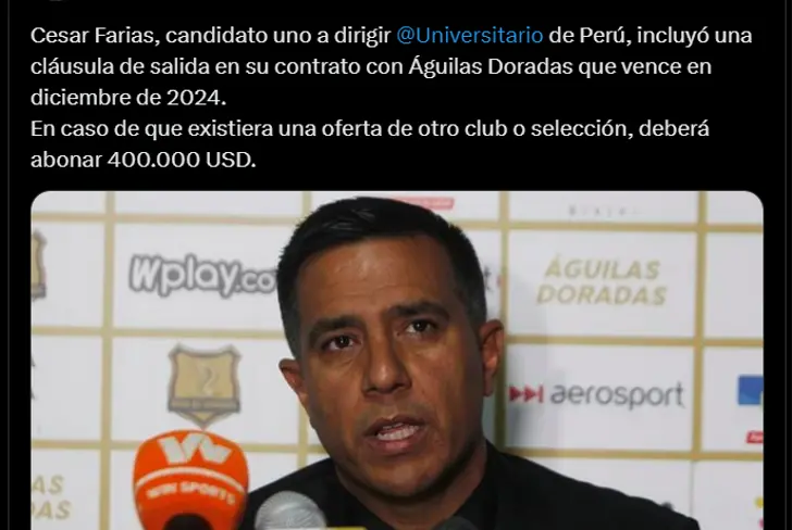 “Cesar Farias, candidato uno a dirigir Universitario de Perú, incluyó una cláusula de salida en su contrato con Águilas Doradas que vence en diciembre de 2024. En caso de que existiera una oferta de otro club o selección, deberá abonar 400.000 USD”; fue la más reciente y reveladora información con la que el comunicador argentino Mariano Olsen está dando la hora a nivel internacional por lo que represente el inminente arribo del técnico venezolano al torneo local.