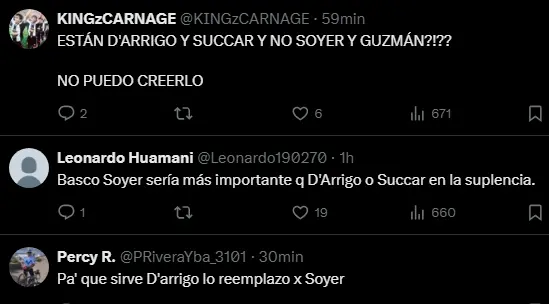 Mientras Soyer fue descartado, jugadores como Jhamir D’Arrigo y Matías Succar, quienes tuvieron un pobre desempeño ante ADT en la última jornada de la Liga 1, sí fueron incluidos en la lista. Esto ha generado el descontento de los fanáticos, quienes esperaban que Gorosito apostara por un cambio tras la dura caída en Tarma.