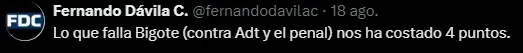 "Lo que falla Bigote (contra Adt y el penal) nos ha costado 4 puntos", fue lo que comentó un hincha molesto en la red social X, donde acusa a Sebastián Rodríguez de ser el culpable de perder 2 jugadas que pudieron cambiar la historia para el cuadro de La Victoria. Hoy en día, el conjunto de Alianza Lima estaría puntero con suma tranquilidad a 4 puntos de diferencia de Universitario de Deportes, en lugar de estar empatados en el primer lugar como están actualmente. Por lo tanto, el cuadro de Mariano Soso no puede seguir equivocándose a la hora de definir frente al arco.