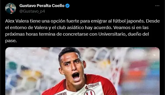 “Alex Valera tiene una opción fuerte para emigrar al fútbol japonés. Desde el entorno de Valera y el club asiático hay acuerdo. Veamos si en las próximas horas termina de concretarse con Universitario, dueño del pase”; fue la más reciente y reveladora información que compartió el comunicador nacional Gustavo Peralta a través de su cuenta oficial de twitter en señal de que el atacante peruano podría despedirse de Ate si es que las negociaciones con el exterior terminan dándose de la mejor manera para las partes implicadas. Apuesta en Betsson a los partidos de las mejores ligas del mundo y recibe un bono de bienvenida de 50 soles