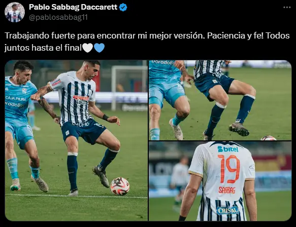 "Trabajando fuerte para encontrar mi mejor versión. ¡Paciencia y fe! Todos juntos hasta el final", fue lo que publicó Pablo Sabbag en sus redes sociales, siendo este más que todo un mensaje para el hincha, el cual está bastante molesto en estos momentos por la situación de Alianza Lima, que ha perdido 4 puntos importantes en la lucha por el Torneo Clausura, por lo que no dejan de llover críticas a muchos de los jugadores titulares del equipo, así como parte de la directiva.