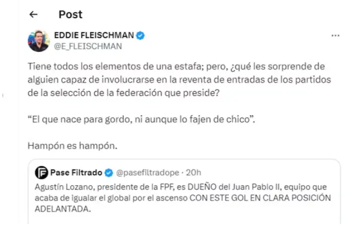 "La corrupción yapechongo despachando cotidianamente en su oficina. Está recontra cocinado. Tiene todos los elementos de una estafa; pero ¿qué les sorprende de alguien capaz de involucrarse en la reventa de entradas de los partidos de la selección de la federación que preside? El que nace para gordo, ni aunque lo fajen de chico. Hampón es hampón"; fue la contundente apreciación de Eddie Fleischman en relación al ascenso de Juan Pablo II a la Liga 1, club del cual es dueño Agustín Lozano y quien fue tildado de 'Hampón'.