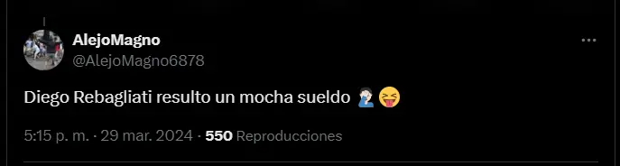 Ahora, a raíz de toda esta situación que se está se está generando una bola de comentarios muy resonantes y llamativos en el ámbito deportivo local es que hemos podido conocer de un nuevo y muy curioso apodo que ha recibido Diego Rebagliati tras ser acusado de ser un mal tipo. ´Mocha sueldo´ es la tremenda chapa que le pusieron en las redes sociales y que ha generado tendencia por la manera en que se ha sido expuesto de cobrar su tajada de contratos futbolísticos.