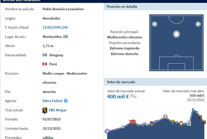 De acuerdo al portal especializado ‘Transfermarkt’, podemos apreciar que Pablo Lavandeira tiene una cotización internacional de 400 mil euros, lo que en soles daría un promedio cercano a los 1,6 millones. No es una cantidad gigante ni nada por el estilo, aunque a la vez se ha podido revelar la información de que la directiva de FBC Melgar no piensa en un préstamo por los servicios del volante, sino que el club que realmente esté interesado en el uruguayo-peruano tendrá que desembolsar alrededor de 300 mil dólares para ficharlo. No sería nada fácil y veremos si es que Sporting Cristal se la juega por esta contratación que sin duda alguna les daría más categoría y calidad.