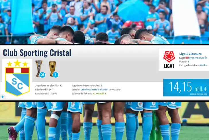 De acuerdo al portal internacional ‘Transfermarkt’, podemos apreciar que el plantel de Sporting Cristal en su totalidad tiene una cotización monetaria de 14,15 millones de euros, lo que en soles daría un promedio muy cercano a los 56,6 millones. Entre sus jugadores con mejor valor en el mundo tenemos a Joao Grimaldo, costando 1,5 millones de euros, Santiago González, costando 1,3 millones de euros, y Jhilmar Lora, costando 1 millón de euros. A su vez, y para alegría de todos los aficionados, los rimenses son el equipo más caro del fútbol peruano, por encima de Alianza Lima, con 14,08 millones, y Universitario de Deportes, con 13,08 millones.