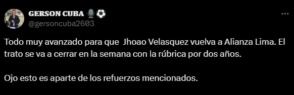 " Todo muy avanzado para que Jhoao Velasquez vuelva a Alianza Lima. El trato se va a cerrar en la semana con la rúbrica por dos años. Ojo esto es aparte de los refuerzos mencionados", fue lo que mencionó el periodista deportivo, Gerson Cuba, por lo que todo indica que habrían más posibilidades de poder contratar por parte de Alianza Lima, puesto que esta es una de las apuestas jóvenes que por ahora tiene el club.