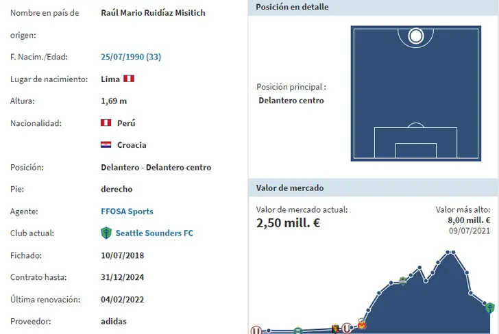 El atacante peruano de 33 años tiene una cotización internacional de 2,5 millones de euros, lo que en soles daría un promedio cercano a los 10 millones, de acuerdo al portal especializado ´Transfermarkt´. Es importante mencionar que Raúl Ruidíaz tiene vínculo contractual con el Seattle Sounders de la MLS de los Estados Unidos hasta finales de este año 2024, aunque es muy probable que pueda renovar por unas temporadas más al seguir marcando la diferencia y ya ser uno de los goleadores históricos de la institución.