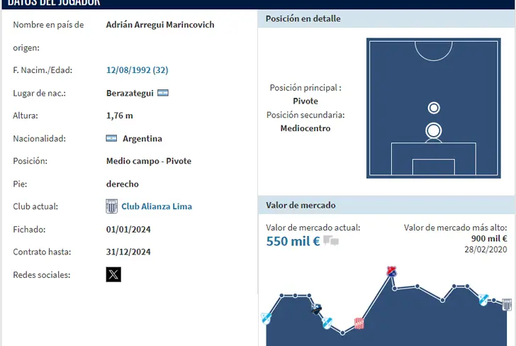 Según la web internacional 'Transfermarkt', podemos apreciar que Adrián Arregui tiene una cotización monetaria de 550 mil euros, lo que en soles daría un promedio cercano a los 2,2 millones. A falta de pocas jornadas que termine el Torneo Clausura 2024 y viendo que Alianza Lima es el firme candidato a quedarse con dicho título al estar primero en la tabla de posiciones con 20 unidades, la recuperación del volante argentino podría caerles como anillo al dedo para darle un salto de calidad al vestuario.