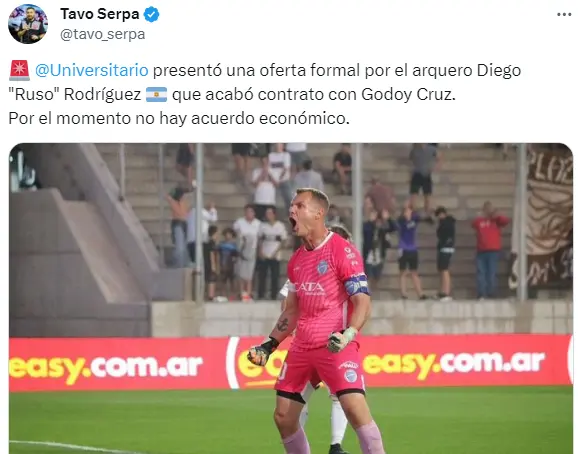 "@Universitario presentó una oferta formal por el arquero Diego "Ruso" Rodríguez que acabó contrato con Godoy Cruz. Por el momento no hay acuerdo económico", esto es lo que se pudo llegar a conocer mediante el periodista deportivo Gustavo Serpa, quien publicó en sus redes sociales este anuncio, así que la U va a tener que pagar una alta ficha si lo quiere.