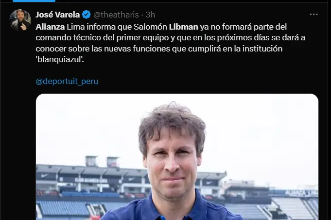 "Alianza Lima informa que Salomón Libman ya no formará parte del comando técnico del primer equipo y que en los próximos días se dará a conocer sobre las nuevas funciones que cumplirá en la institución 'blanquiazul'"; fue la información más reciente compartida por el comunicador deportivo José Varela a través de su cuenta de twitter. Con esto, podemos entender claramente que el profesor Mariano Soso ya tiene un equipo de trabajo armado de acuerdo a sus pretensiones y con quienes han venido laborando desde hace algún tiempo en Argentina, Brasil y Chile, incluso en Perú mismo.