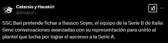 Una noticia bomba sacude el mundo del fútbol peruano: Bassco Soyer, la joven estrella de Alianza Lima, estaría a un paso de fichar por el SSC Bari, equipo de la Serie B de Italia. La información fue revelada por la cuenta de X (antes Twitter) Catarsis y Harakiri, quienes aseguran que las conversaciones entre el club italiano y la representación del jugador están muy avanzadas.