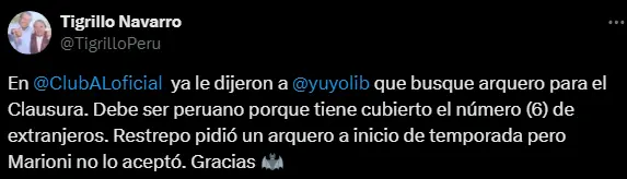 "En @ClubALoficial ya le dijeron a @yuyolib que busque arquero para el Clausura. Debe ser peruano porque tiene cubierto el número (6) de extranjeros. Restrepo pidió un arquero a inicio de temporada pero Marioni no lo aceptó. Gracias", fue lo que dio a conocer el periodista deportivo Carlos 'Tigrillo' Navarro. Apuesta en Betsson a los partidos de las mejores ligas del mundo y recibe un bono de bienvenida de 50 soles