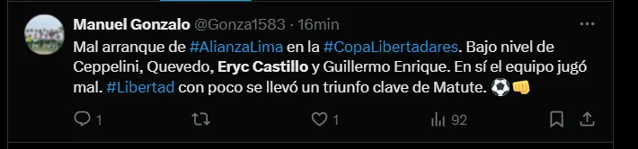 Sin embargo, en el debut del equipo blanquiazul en la Copa Libertadores contra Libertad en Matute, el extremo ecuatoriano estuvo completamente desaparecido, y su actuación dejó mucho que desear. A pesar de las expectativas, Castillo no pudo replicar el nivel que mostró en la Liga 1 y no logró marcar la diferencia ante el conjunto paraguayo.