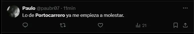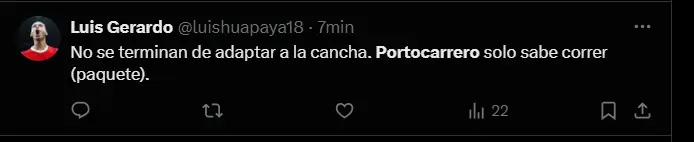 “No se terminan de adaptar a la cancha. Portocarrero solo sabe correr (paquete)”, “Portocarrero en lo que sea que juegue es peor que Dorregaray de centrodelantero y no estoy de humor para debatirlo”, “Lo de Portocarrero ya me empieza a molestar”, “Algún día Portocarrero lanzará un buen pase?” y “Portocarrero es malo... prefiero mil veces a Cabanillas en su prime... lástima que el gordo tampoco ayude”; son algunas de las reacciones más llamativas y resonantes del hincha de la ´U´ a través de las redes sociales.