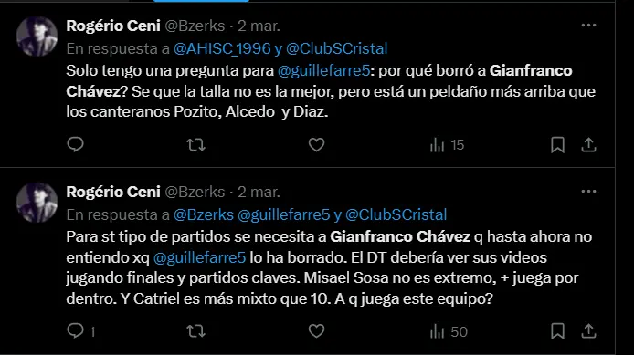 Uno de los puntos más polémicos mencionados por Rebagliati es la falta de un refuerzo en la defensa central. A pesar de la evidente carencia de un jugador de jerarquía en esa posición, Sporting Cristal no ha realizado fichajes en el puesto. Esto, junto con la decisión de Farré de “borrar” a Chávez, ha generado más incertidumbre en torno a la línea defensiva del equipo. Para Rebagliati, es difícil de entender cómo el club no ha tomado cartas en el asunto, ya que la defensa sigue siendo una de las principales debilidades del equipo. La ausencia de Chávez, que había sido una garantía en temporadas anteriores, resalta aún más la necesidad de reforzar esa zona.