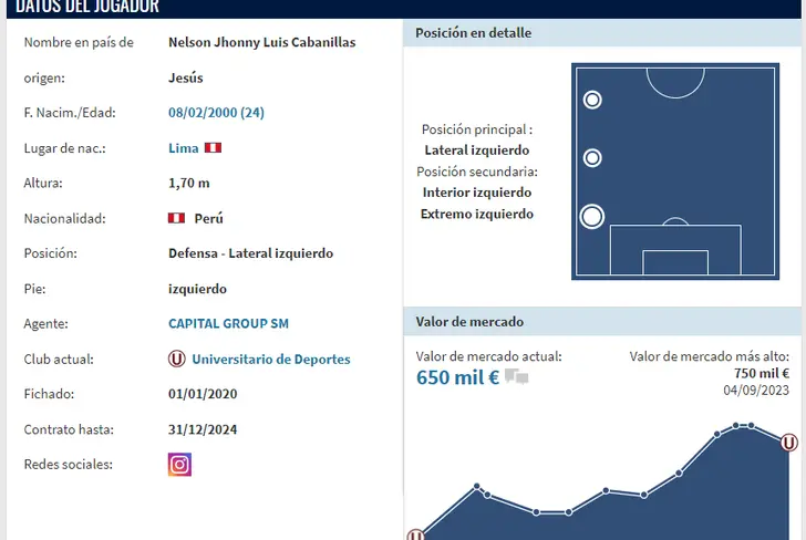 De acuerdo al portal especializado ‘Transfermarkt’, podemos apreciar que Nelson Cabanillas tiene una cotización monetaria de 650 mil euros, lo que en soles daría un promedio cercano a los 2,6 millones. Con 24 años de edad, el hoy defensor de Universitario de Deportes incluso ha tenido ciertos rumores de posible fichaje en el extranjero, así que tranquilamente podría estar esperando la chance de dar un salto de calidad y despedirse muy pronto de la Liga 1 peruana.