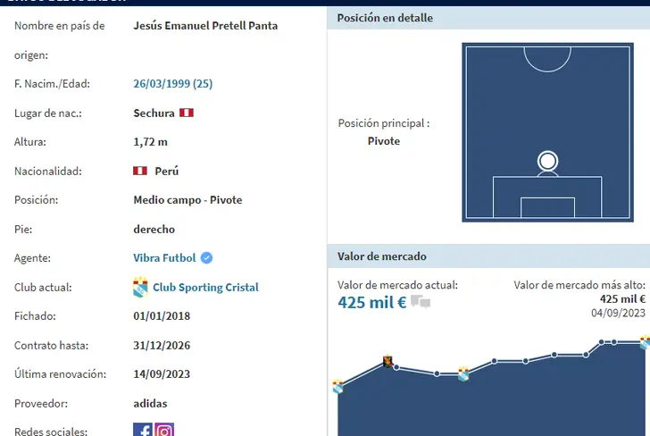 Según el portal especializado 'Transfermarkt', Jesús Pretell tiene una cotización monetaria de 425 mil euros, lo que en soles daría un promedio de 1,7 millones. Con 25 años de edad y un buen presente en Sporting Cristal, el volante nacional incluso podría pensar en llegar a la Selección Peruana si es que desde las instalaciones de Videna lo están evaluando para que pueda ser una de las gratas sorpresas pensando en el mes de septiembre, quién sabe.