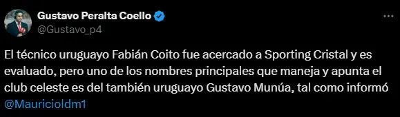 Sporting Cristal hace nada nomas se quedó sin entrenador, de un momento a otro Enderson Moreira terminó fuera del equipo 'cervecero', sus malos resultados y no haber podido ganar el Torneo Apertura hicieron que tenga que salir, es así como ahora en La Florida están buscando nuevos nombres, hay uno que dirigió en España y que es el que más está gustando, su nombre es Gustavo Munúa.
