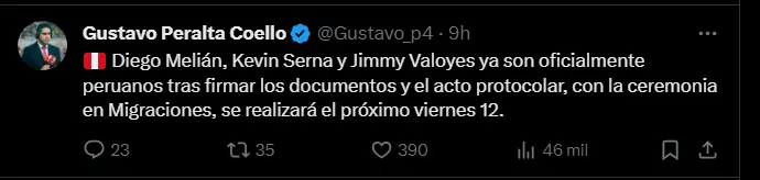 “Diego Melián, Kevin Serna y Jimmy Valoyes ya son oficialmente peruanos tras firmar los documentos y el acto protocolar, con la ceremonia en Migraciones, se realizará el próximo viernes 12”; fue la más reciente y tajante información con la que el reconocido comunicador deportivo Gustavo Peralta viene siendo tendencia en las redes sociales al revelar una noticia que sin duda alguna tendría saltando en un pie al profe Restrepo y a su comando técnico.