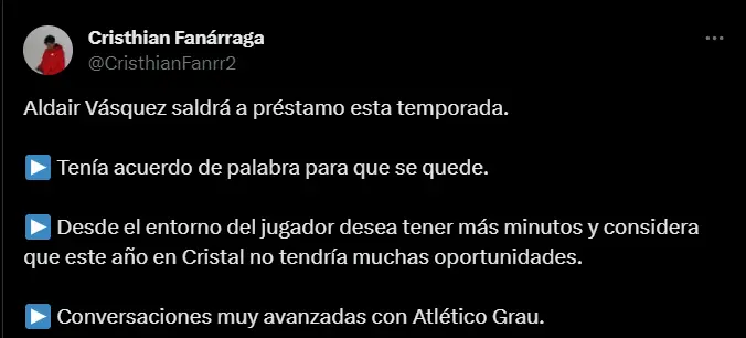 “Aldair Vásquez saldrá a préstamo esta temporada. Tenía acuerdo de palabra para que se quede. Desde el entorno del jugador desea tener más minutos y considera que este año en Cristal no tendría muchas oportunidades. Conversaciones muy avanzadas con Atlético Grau”; fue la más reciente y reveladora información del comunicador deportivo Cristhian Fanárraga en relación a la decisión que habría tomado el joven atacante que tranquilamente pudo ser parte de las planificaciones del profesor Enderson Moreira.