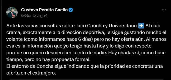 “Ante las varias consultas sobre Jairo Concha y Universitario: Al club crema, exactamente a la dirección deportiva, le sigue gustando mucho el volante, pero no hay oferta aún. Al menos esa es la información que yo tengo hasta hoy y lo digo con respeto porque no quiero desmerecer la info de nadie. Hay charlas sí, como hace tiempo, pero no hay propuesta formal. El entorno de Concha sigue indicando que la prioridad es concretar una oferta en el extranjero”; fue el dato que soltó el comunicador nacional Gustavo Peralta. Apuesta en Betsson a los partidos de las mejores ligas del mundo y recibe un bono de bienvenida de 50 soles