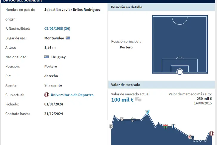 De acuerdo al portal internacional ‘Transfermarkt’, podemos apreciar que Sebastián Britos tiene una cotización monetaria de 100 mil euros, lo que en soles daría un promedio cercano a los 400 mil. Con 36 años y una temporada muy buena con la camiseta de Universitario de Deportes, cualquiera podría pensar que tendría para unos cuantos campeonatos más en la Liga 1, así que desde ya la directiva viene trabajando en que pueda quedarse por más tiempo en Ate.