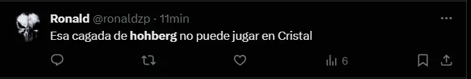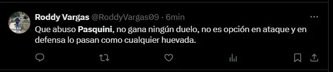 “Que abuso Pasquini, no gana ningún duelo, no es opción en ataque y en defensa lo pasan como cualquier huevada”, “A ver si sacamos a Pasquini hoy más Paquetini que nunca”, “Que muerto es Hohberg”, “Esa cagad… de Hohberg no puede jugar en Cristal”; son algunos de los comentarios más llamativos de los aficionados bajopontinos que vienen apoderándose de twitter a pesar de que consiguieron una importante victoria.