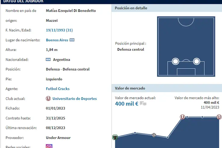 El zaguero argentino de 31 años tiene una cotización internacional 400 mil euros, lo que en soles daría un aproximado de 1,6 millones, según la web especializada 'Transfermarkt'. Veremos si es que con el pasar de los siguientes entrenamientos en Universitario de Deportes es capaz de recuperar su lugar de privilegio en el equipo o de todas maneras queda confirmado más como una opción de recambio y a esperar que Gustavo Dulanto pueda perderse del radar.