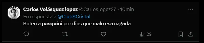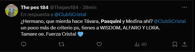 “¿Hermano, que mierd... hacen Távara, Pasquini y Medina ahí? @ClubSCristal un poco más de criterio ps, tienes a WISDOM, ALFARO Y LORA. Tamare oe. Fuerza Cristal” y “Boten a Pasquini por dios que malo esa cagada”; fueron algunos de los comentarios más llamativos de los hinchas de Sporting Cristal en señal de que andan recontra descontentos con la continua apuesta que existe por el argentino como titular en el carril izquierdo.