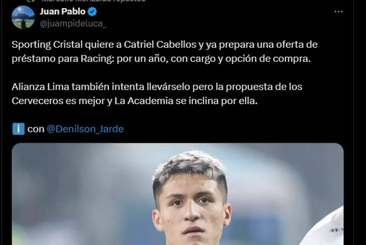 Sporting Cristal ha presentado una propuesta formal a Racing Club para obtener el préstamo de Catriel Cabellos por un año. Esta oferta incluiría una carga económica para el club argentino y una opción de compra al finalizar el préstamo. Esta propuesta resulta atractiva para Racing, que busca obtener un beneficio económico inmediato y asegurarse una futura ganancia en caso de que Cabellos se valore aún más en el fútbol peruano.